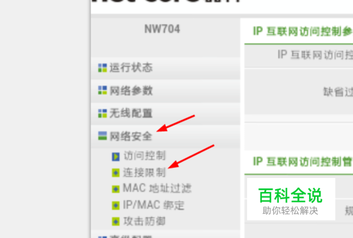 然后我们点击路由器的高级设置,进入路由器的界面,找到网络安全,点击连接限制,如图所示