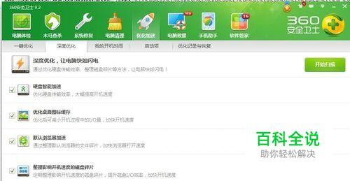 平时要常用 360 卫士 、金山卫士等工具清理系统垃圾和上网产生的临时文件,清除IE 缓存,查杀恶意软件。这是最简单的方法不用自己手动。下面我以360卫士为例,首先用请看下面图示:先用优化加速按钮,再用优化加速下面的深度优化,再选择电脑清理选项。