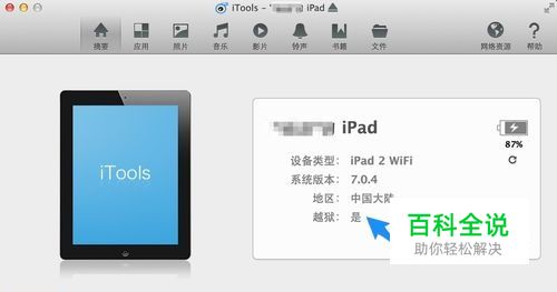 首先把 iPad 与电脑用原装的数据线连接起来,这里以 iTools 软件为例,可以看到越狱一处显示 “是”,说明当前 iPad 已经越狱,如图所示