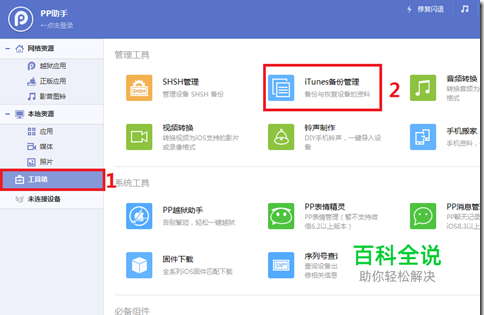 下载并安装运行“PP助手”软件。首先,点击左侧的“工具箱”,然后,点击右侧的“iTunes备份管理”