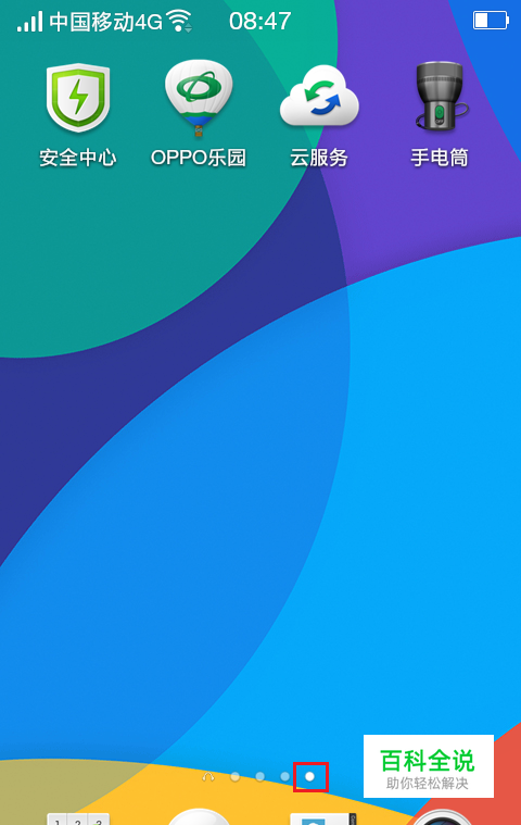 进入手机主屏幕。屏幕偏下部居中位置有四个小圆点,代表手机有四屏应用程序小图标。主屏幕是第一屏。
