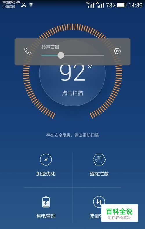 在手机桌面上找到手机管家的快捷方式,打开后点击扫描,进行一键清理,清理不常用的程序。