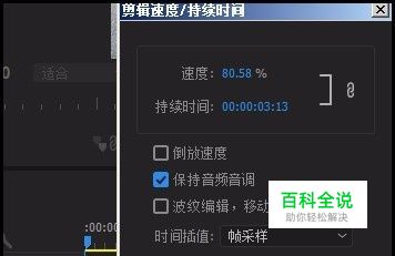然后,修改持续时间; 再勾选,保持音频音调 点确定。那么,这一部分视频就被拉长了。
