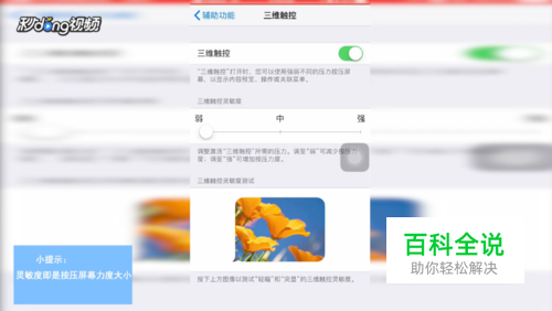 点击“辅助功能”,点亮“三维触控”光标,并可调整灵敏度。