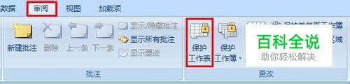 首先,得找到锁定内容的按钮工具,excel2007在审阅下保护工作表。