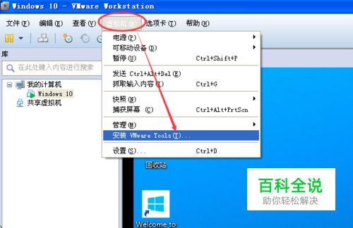 打开VMware虚拟机,点击导航栏上的虚拟机,选择弹出下拉菜单里的安装VMware Tools。如下图所示。