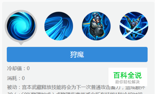 首先是宫本武藏的被动技能为“狩魔”(详见下方图片内),使宫本武藏释放技能将会为下一次普通攻击蓄力,造成额外30(+60%物理加成)点物理伤害并减少所有技能1秒冷却时间。