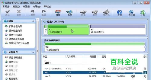 首先我们下载这个免费的软件,然后进行安装操作。进入软件主页面。可以看到左边有很多详细的工具栏目。以及右边有硬盘的容量,以及使用率的描述,非常详细。 看到C盘:是15GB,F分区是1G。