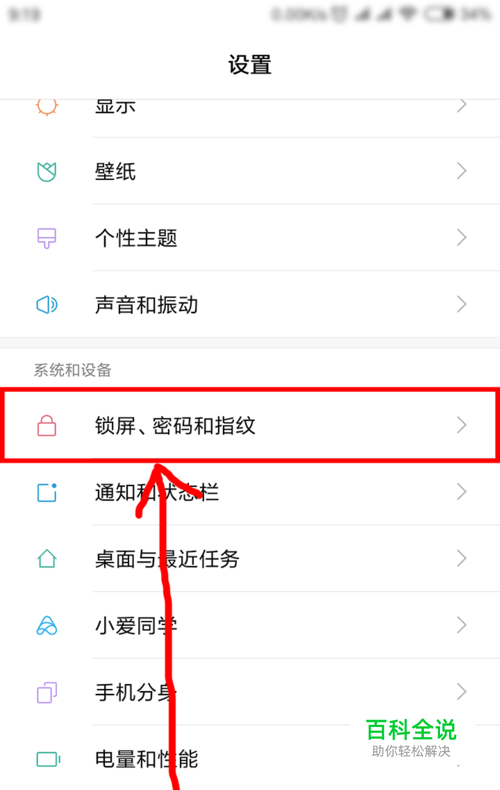 在设置列表里找到【锁屏、密码和指纹】这个选项,点击进去。