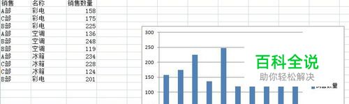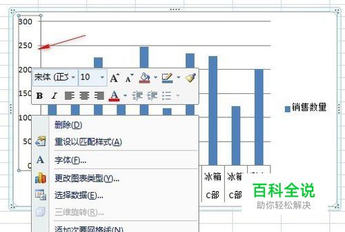 如图这是一张家电行业销售业绩表。我们想把Y轴间隔修改成不是从0开始的坐标轴。因为我们可以看到销售量最小的超过100,最大也不超过260.
