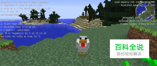 手拿小麦种子,对着一只鸡点右键来喂鸡。