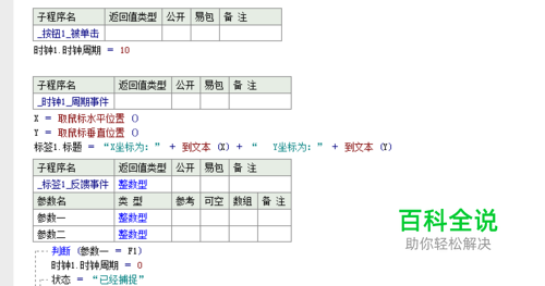 第三步:取点击坐标位置 点击按钮1,进入代码区。启动时钟事件,时钟中期为10ms. 双击时钟,进入时钟周期事件,取鼠标所在的横坐标与纵坐标分别为X、Y,并在标签1上显示。 点击标签1,进入标签反馈事件,判断参数一的数值,如果等于F1则停止时钟周期事件,说明取位置成功,给变量“状态”赋值“已经捕捉”;如果等于F2,则结束程序。