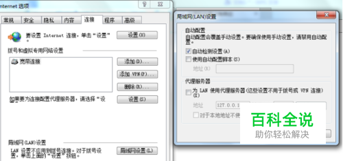 检查IE代理设置 另外找一下代理连接设置,改成用你能上网的拨号连接(不要设置代理)