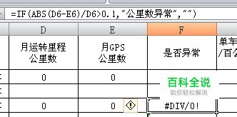 先看显示的原公式,=IF(ABS(D6-E6)/D6>0.1,"公里数异常",""),虽然考虑了绝对值情况,但是除零就会错误显示