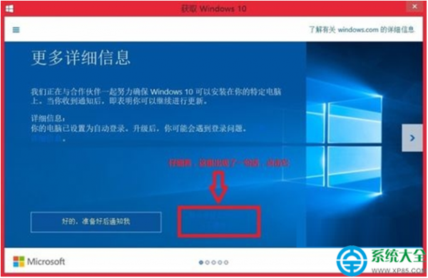 3、打开升级助手,在更多详细信息窗口中,中间靠下的位置出现了一句话,点击它。(睁大眼睛仔细找!!!)