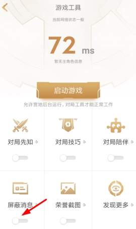 2、点击游戏工具页面的下方列表的“屏蔽消息”功能,点击下方的按钮即可开启勿扰模式。