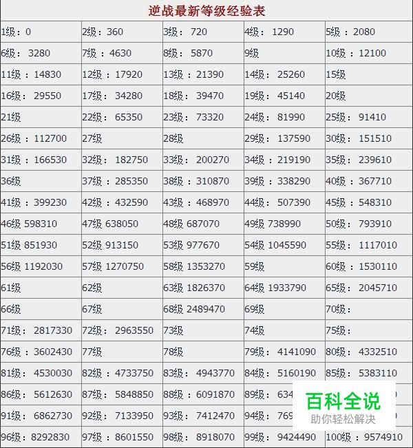 1-100级虽然说需要的经验并不算太多,但是游戏之初没有太多的武器加成,升级还是有点难度的,等到后期的时候类似“雷霆999”、“烈焰战神”、“极寒冰焰”这样加经验的枪增多,前100级也就没什么难度了,以下是1-100级经验表