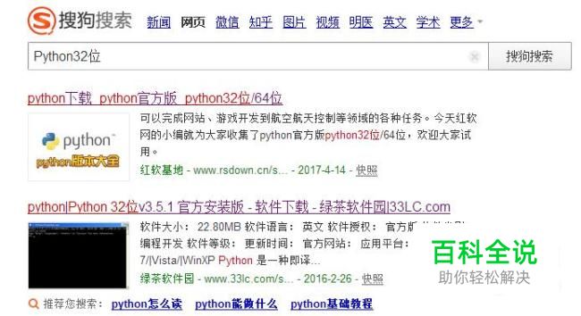 到搜狗浏览器上搜索并下载和你电脑系统位数相对应的Python,32位或64位。