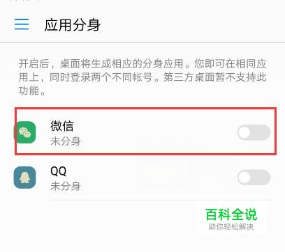 我们发现在其中有两个支持应用分身的软件,一个是微信,一个是QQ,将微信后面的开关打开。