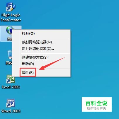 我们遇到此种情况在桌面上找到网络快捷图标,并点击鼠标右键,找到属性选项,如图所示: