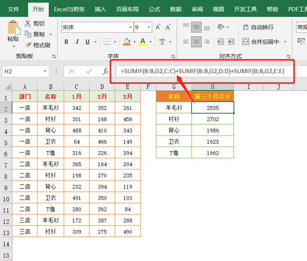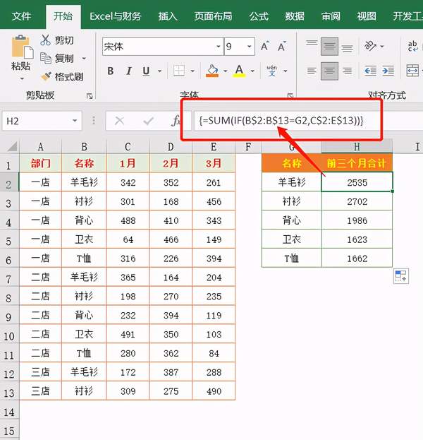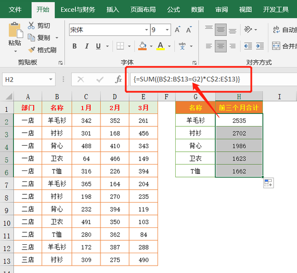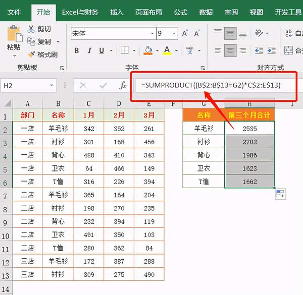 这个公式与上一个比较省了IF函数判断,利用B$2:B$13=G2产生的逻辑值(0和1)与数据区域相乘。