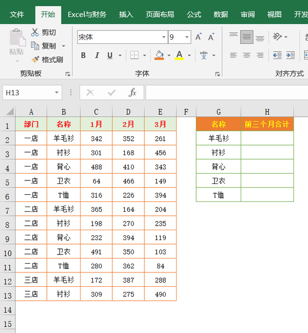实例:下图表格中,要求计算各产品的前三个月销量合计数;