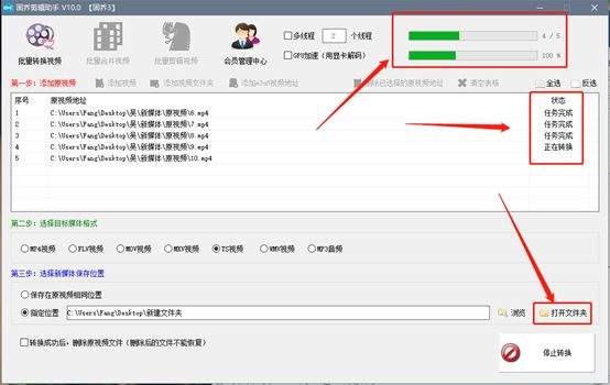 转换视频格式的时候,在页面右上角可以看到转换的进度条和状态,等状态全部显示任务完成之后,我们就可以打开文件夹查看了。