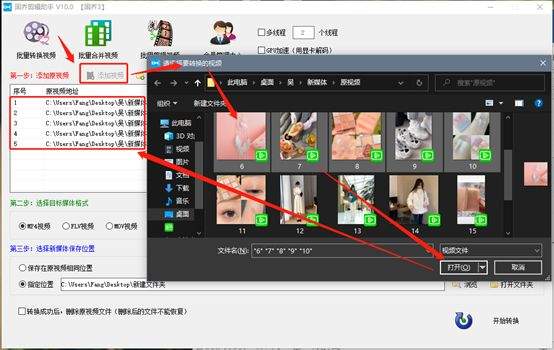 接下来我们就开始来添加需要转换的视频文件,点击“添加视频”,在弹出的窗口里选择视频,可以选择多个视频一起批量转换,如图: