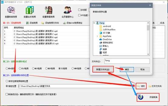 视频格式选择好之后,我们还要再设置一下视频的保存位置,大家自己选择要如何保存,小编这里选择第二个,然后点击“浏览”,在弹出的窗口选择或者新建文件夹,设置好就开始转换。
