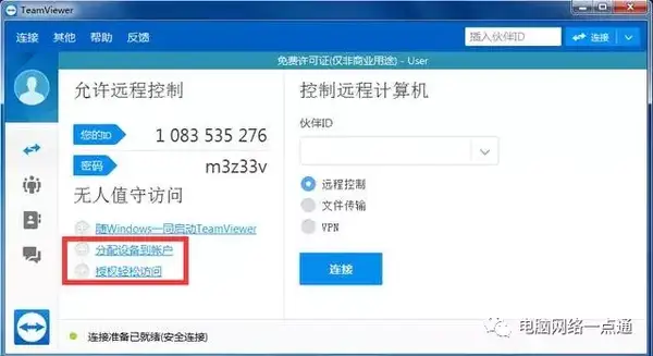这种远程控制方法要求被控制电脑端需要提前打开TeamViewer软件,且需知道电脑端TeamViewer的ID和密码,但是电脑端TeamViewer密码是随机生成的,每次打开的密码都不同。为了解决这个问题建议注册一个TeamViewer账号并登陆,同时授权轻松访问且分配设备到账户,之后只要手机端和电脑端登陆相同的TeamViewer账号,手机端就可以轻松远程连接电脑了,不需每次都输入随机密码(记住ID前两位数字即可,软件会自动联想)。如有不清楚的地方直接右上角私信我