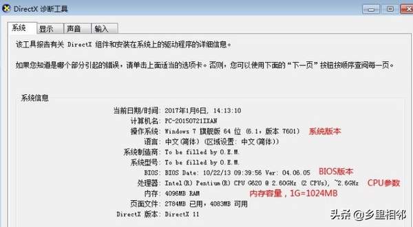 在“系统”选项卡中查看处理器参数、内存容量、BIOS版本和DirectX版本