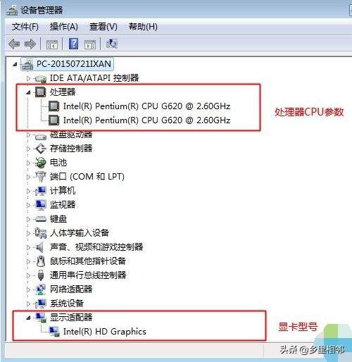 展开“处理器”和“显示适配器”,查看处理器几核心、频率和显卡的型号信息。
