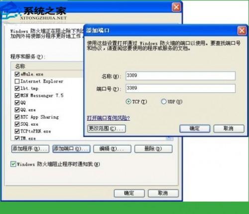 如果开启了Windows XP SP2的防火墙,还必须允许通过3389端口进行连接。具体方法是:依次打开“网上邻居”→“查看网络连接”,点击左上栏中的 “更改Windows防火墙设置”,在弹出的“Windows防火墙”窗口中,切换到“例外”选项卡,点击“添加端口”按钮,在接下来的窗口中,输入“名称”(可随意命名)和“端口号”:3389,确定即可。