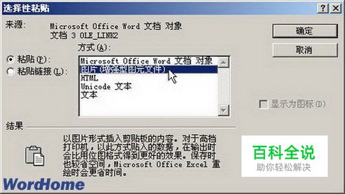 第2步,选中该大字并执行“复制”操作,然后打开Excel窗口,在菜单栏依次单击“编辑”→“选择性粘贴”菜单命令,打开“选择性粘贴”对话框。在“方式”列表框中选中“图片(增强型图元文件)”选项,并单击“确定”按钮。
