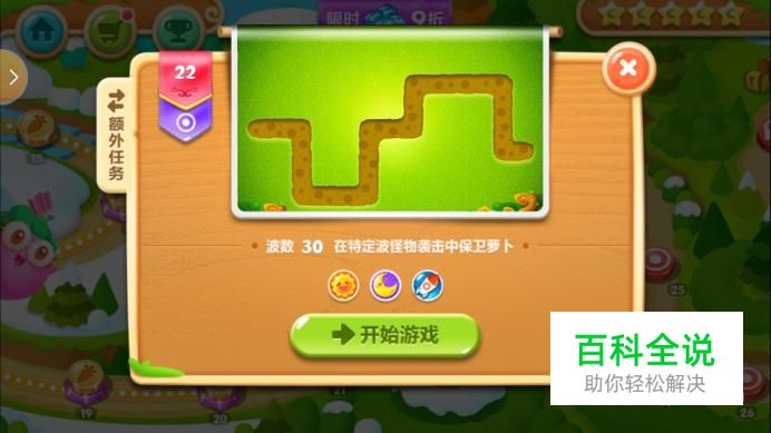 查看关卡信息。首先这一关是保卫萝卜2的第一个双出口关卡,路线比较短,难度就相对的增大了。这一关总共有30波怪物,算是怪物比较多的一关了。这一关提供的炮塔有太阳花炮塔,月亮炮塔和火箭炮,月亮炮塔可以减速,太阳花炮塔可以快速的清除障碍,火箭炮塔的攻击力超级高,从炮塔来看还算是比较适合的。