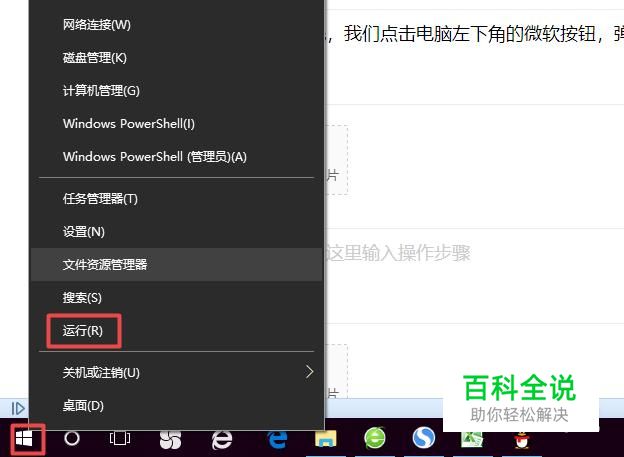 首先,我们右击电脑左下角的微软按钮,弹出的界面,我们点击运行;