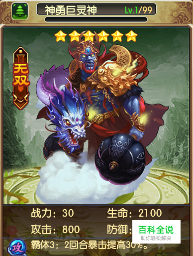分享西游有妖气之巨灵神和二郎神,讲讲他们的战力、生命、攻击技能。 1、神勇巨灵神 看过《西游记》的朋友,应该对这位神将多少有些了解吧!巨灵神的兵器是宣花大锤,舞起来呼呼作响,但是招式却又显轻巧,可谓是举重若轻。他与哪吒一同镇守南天门,自身力大无穷,乃是李天王帐下的一员猛将。在征讨花果山的过程中,虽然吃了败仗,但是大家不可否认他的勇猛。 在游戏中,巨灵神也是六星级别的,他的血量属性的成长是很高的,在同星级的神将中,算是比较靠前的了。巨灵神1级时,战力为30,生命值为2100,攻击力有800,防御力为300。攻击技能霸体3,这个技能能够提高自身的暴击概率,提升值为30%,效果持续两个回合。另一个主要技能为防护3,这个技能使用之后,能够提高自身的防御力,提升值为250%。 2、二郎神 二郎神乃是玉帝外甥,身上流着仙凡两种血液。在曾助武王伐纣,并立下赫赫战功。在《西游记》中,我们可以看到二郎神与孙悟空斗得旗鼓相当,可谓是神通广大。