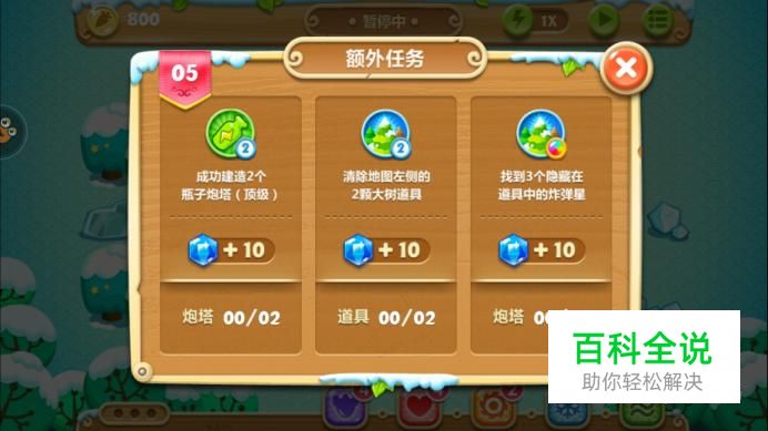 先来看一下额外任务,需要“成功建造2个顶级的瓶子炮塔”,“消除地图左侧的2棵大树道具”,“找到三个隐藏在道具中的炸弹星”,难度主要在最后一个,就让我们一起来寻找炸弹星吧。