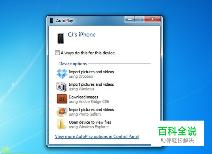 等待你的电脑识别你的iPhone设备,这个过程可能持续几分钟。识别后会出现设备相关选项的对话框。 该窗口称为自动播放窗口。 你可以在Windows控制面板下的硬件和声音选项里找到并打开自动播放功能。事实上,你可以将手机设置为一旦手机连接电脑就自动进行照片传输。