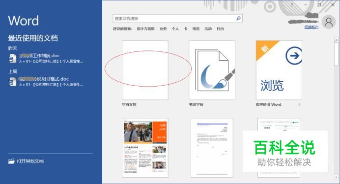 启动Word 2016文字处理应用软件,如图所示点击屏幕右侧新建空白文档。