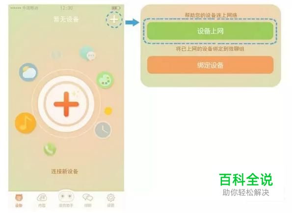 按设备说明书提示进入设备联网状态,根据设备的语音提示进入淘云互动APP设备页面,点击右上角的+号选择