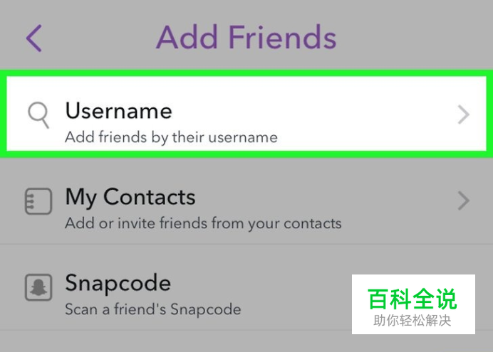 通过用户名来添加好友。在Snapchat程序中,最快捷的添加好友的方式就是输入好友的用户名来添加他们。所以请尽可能地想办法获得好友在Snapchat上使用的用户名。除非他(她)在程序的设置中允许他人通过电子邮件、真名或电话号码来找到他(她),否则,你将无法通过以上信息来添加好友。 在Snapchat拍摄界面的任意位置,向下滑动屏幕。这会打开资料页面,以及选项页面。 轻触 添加好友按钮。这会带你进入添加好友的界面中。 轻触 通过用户名添加。 接着就会出现用户名搜索框。 输入你想要加为好友的人的用户名。在搜索框内输入用户名,进行搜索,程序会在搜索框下列出符合你搜索条件的用户。 轻触用户旁边的“ ”按钮。根据他们账户的隐私设置,你可能能看到他们的头像图片。点击“ ”来将其添加到好友列表。