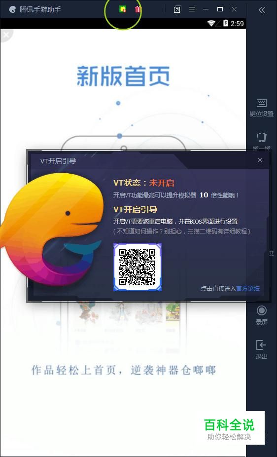 点击顶部绿色圈那个图标,点进去会显示vt未开启,点击弹出窗口右下角的蓝色字体"官方论坛"。