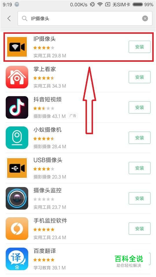 我们先进入APP应用商店搜索“IP摄像头”软件,如下所示,点击下载。