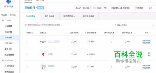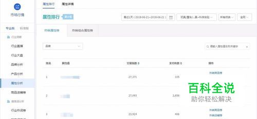 点击属性分析,这个指标里面可以看到各个品牌店铺内商品销售占比情况,点击进入单个品牌,会按照品牌店铺内产品选定周期内的销售高低进行排序展现。对手的销售产品情况可以为我们提供产品单价布局参考意见。