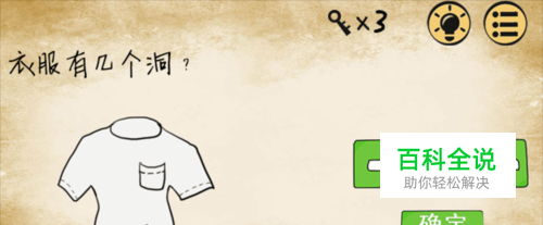 第29关:衣服有几个洞? 提示:衣服正面的两个洞,其实还贯穿到背面去了,所以算的时候要x2,也就是4个,领口,两个袖口,下摆,口袋。 答案是:9