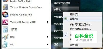 点击左下角的开始菜单,找到菜单中的计算机,然后鼠标选中计算机点击右键,然后找到出现的管理菜单项,点击鼠标左键。