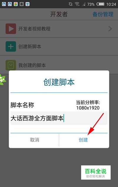 在弹出的创建脚本界面,输入想要创建的游戏脚本的名称,如“大话西游全方面脚本”,点击“创建”。
