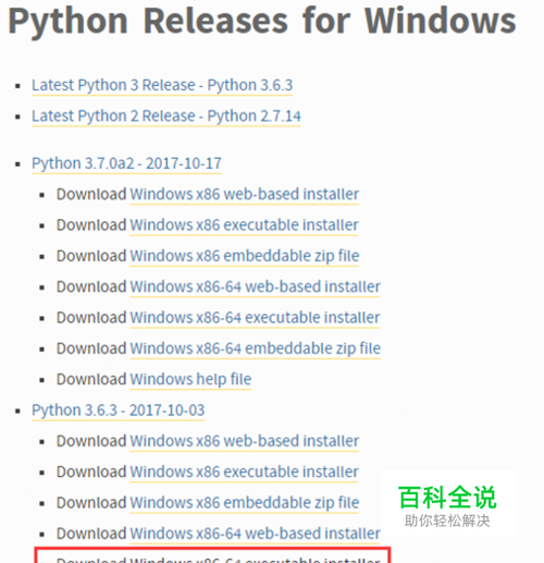 二. 选择适合你操作系统类型和python版本。 我的是64位操作系统,由于当前python3.7版本还是不是稳定版,咱们学习用先选择稳定版本,我这里选择python3.6.3。然后点击下载即可。