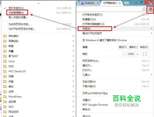 运行google浏览器,依次点击【自定义及控制Google Chrome】---【书签】----【书签管理器】